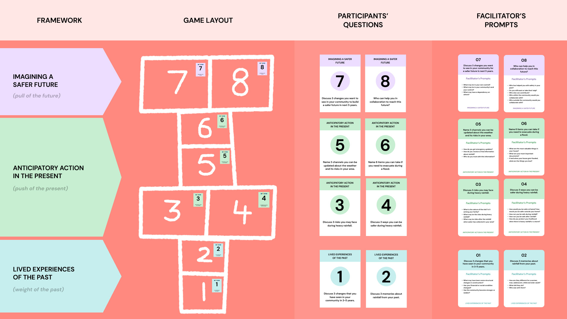 The service is designed keeping in mind the design justice framework (2018) while the interaction of the game including the questions and their flow are implemented through the UNDRR’s four pillars of Multi-Hazard Early Warning System (WMO, 2022) and the futures triangle (Inayatullah, 2008) respectively in order to establish the interactive and collaborative game into the service. This builds the experience design of the game encouraging disaster preparedness, awareness and articulation of risks and safety for communities and a human centred design approach through understanding the community’s needs by the volunteering agencies - overall bridging the gaps between local governments & authorities and urban poor communities.